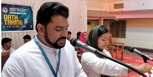 The Victory Day Celebration at Fathima Arts and Science College, Moothedam was held on 14th October 2025, marking a day of pride, enthusiasm, and unity on campus. The morning session began with the Oath-Taking Ceremony of the newly elected College Union. The programme opened with a welcome address by Union Advisor Ms. Asna, followed by an inspiring message from the Principal, Rev. Dr. Shibin P. James, who emphasized the values of unity, responsibility, and student leadership. The Principal then administered the oath to the Chairperson, Ms. Liyana, who subsequently administered the oath to other office bearers including the Vice Chairperson, General Secretary, UUC, Joint Secretary, Fine Arts Secretary, General Captain, and Magazine Editor. The afternoon session featured an energetic performance by the Dilruba Team, who presented “Mutti Paatt.” Their vibrant and interactive performance created a festive atmosphere, with students enthusiastically participating and enjoying the event. The celebration concluded on a joyful note, reflecting the spirit of leadership, teamwork, and togetherness that defines campus life at Fathima Arts and Science College.