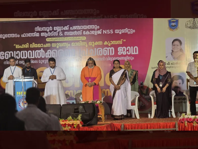 The Honorable MLA Sri.Aryadan Shaukath, inaugurated the ceremony and encouraged students to be vigilant and socially responsible, While the Bursar expressed appreciation for the efforts taken to promote positive students engagement. The ceremony was graced by His Excellency Most Rev. Dr. Joseph Mar Thomas, Bishop of Bathery and Manager of Fatima Arts & Science College, who highlighted the responsibility of youth in building a drug-free society. The Principal Rev.Fr.Dr.Shibin P James addressed the gathering, emphasizing the need for awareness and collective commitment. The ceremony also included the honoring of distinguished guests and the recognition of student achievements in sports and cultural activities.
